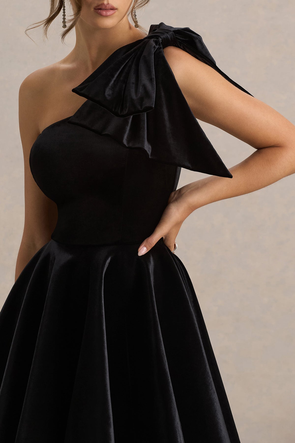 Introducing Keeley, the silhouette that brings all the drama. Designed in our premium black velvet, this playful yet statement-making mini effortlessly flatters. Featuring an asymmetric neckline with a standout oversized bow at the shoulder to add a touch of modern glamour, while the flirty skater skirt brings movement and charm. Perfect for parties, date nights, and everything in between - Keeley is your go-to for bold, feminine energy.