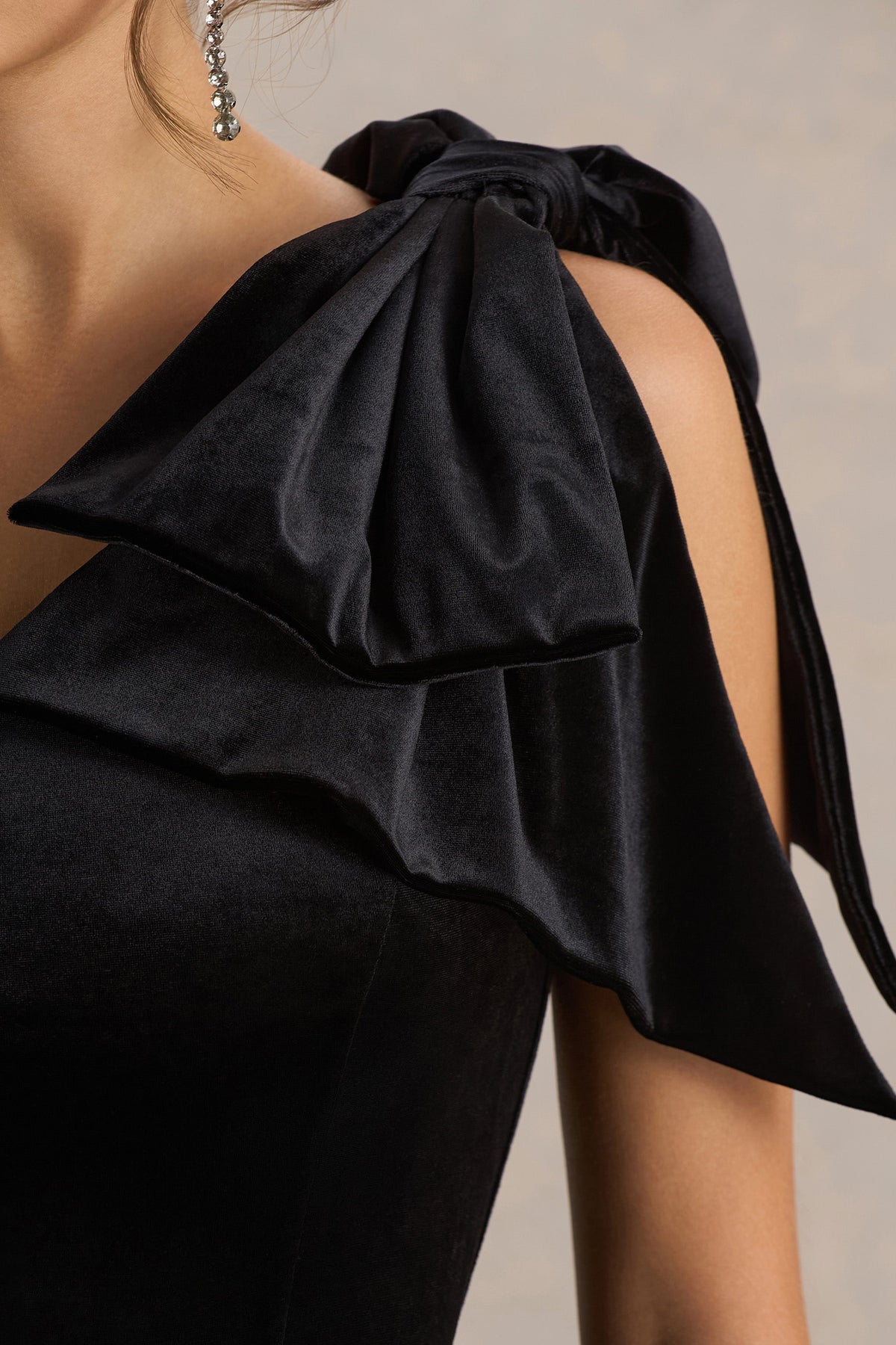 Keeley | Black Asymmetric-Neck Velvet Mini Dress With Bow Detail