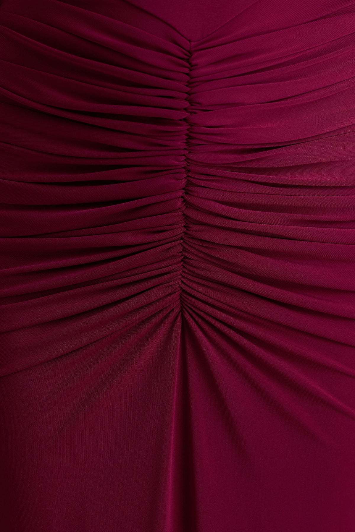 Make your entrance unforgettable in Premiere, a gown designed to captivate from every angle. Crafted in our premium burgundy stretch jersey, this maxi dress hugs and contours in all the right places, effortlessly sculpting your silhouette. Featuring a sophisticated boat neckline and dramatic cape sleeves, Premiere brings red carpet energy to any occasion. The open back adds a touch of allure, while ruched detailing flatters your figure with luxe texture. This floor-sweeping gown is your go-to for black-tie moments, galas, and all things glam.