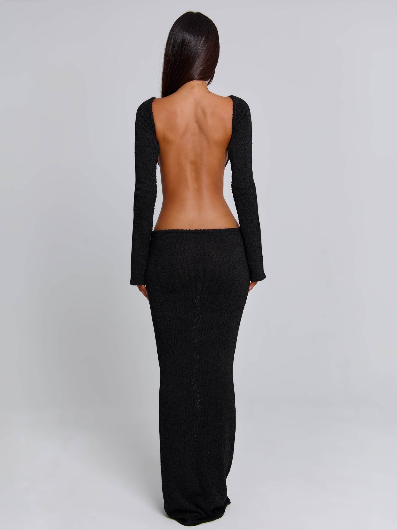 Cut from textured CMT knit, it’s designed to sculpt the body with a flattering body-con fit, maxi hem and soft long sleeves. The gold-tone hardware at the waist gently gathers the fabric to create delicate cut-outs, while the open back adds a refined finishing touch. Beautiful, effortless, and made to move with you.