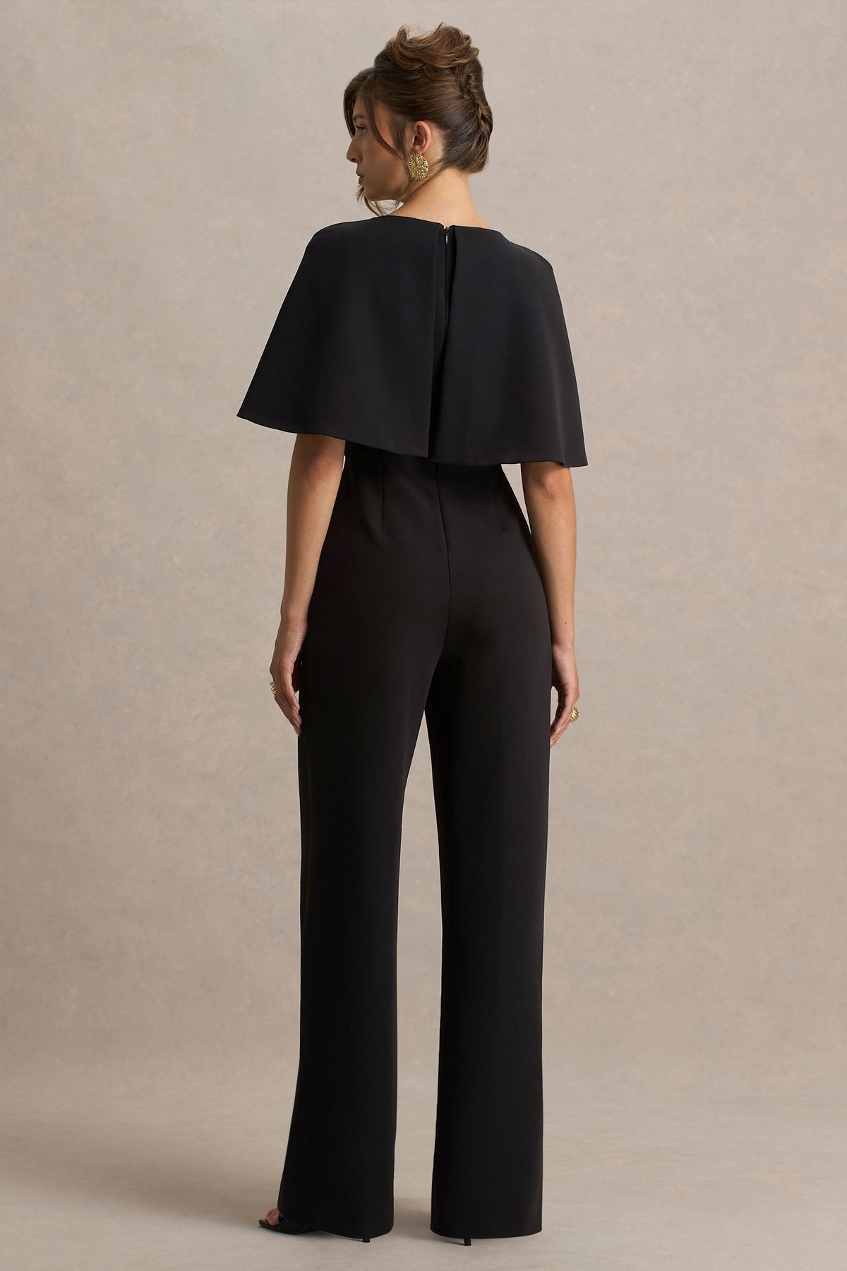 Sleek, striking, and made to command attention, Vivid is a statement piece with undeniable allure. Crafted from our premium black crepe, this jumpsuit balances elegance with drama for a truly unforgettable look. A daring plunge neckline is paired with a structured short cape, while the bow-knot detail creates a delicate and feminine silhouette. A contemporary classic for evenings where sophistication meets bold glamour. Style with sleek heels for a head-turning look.