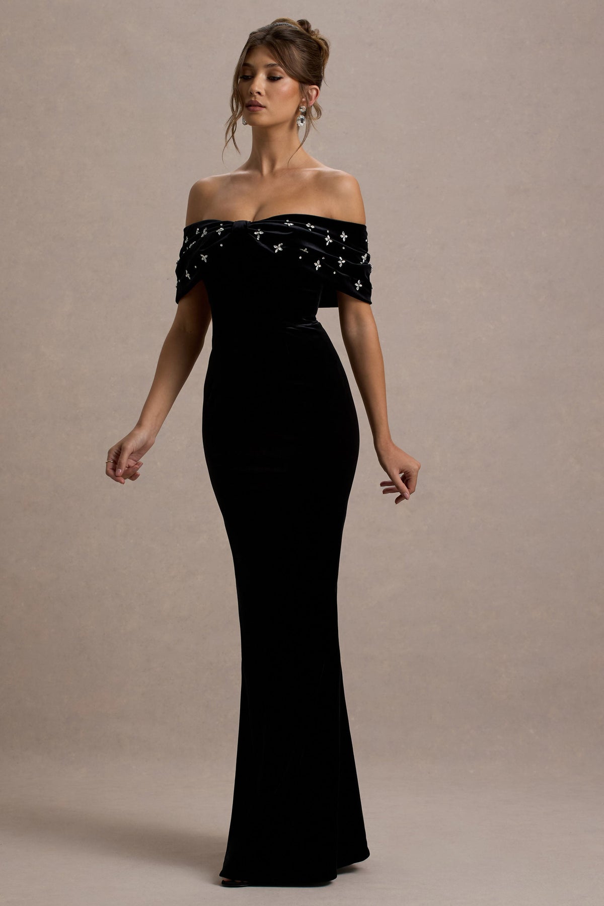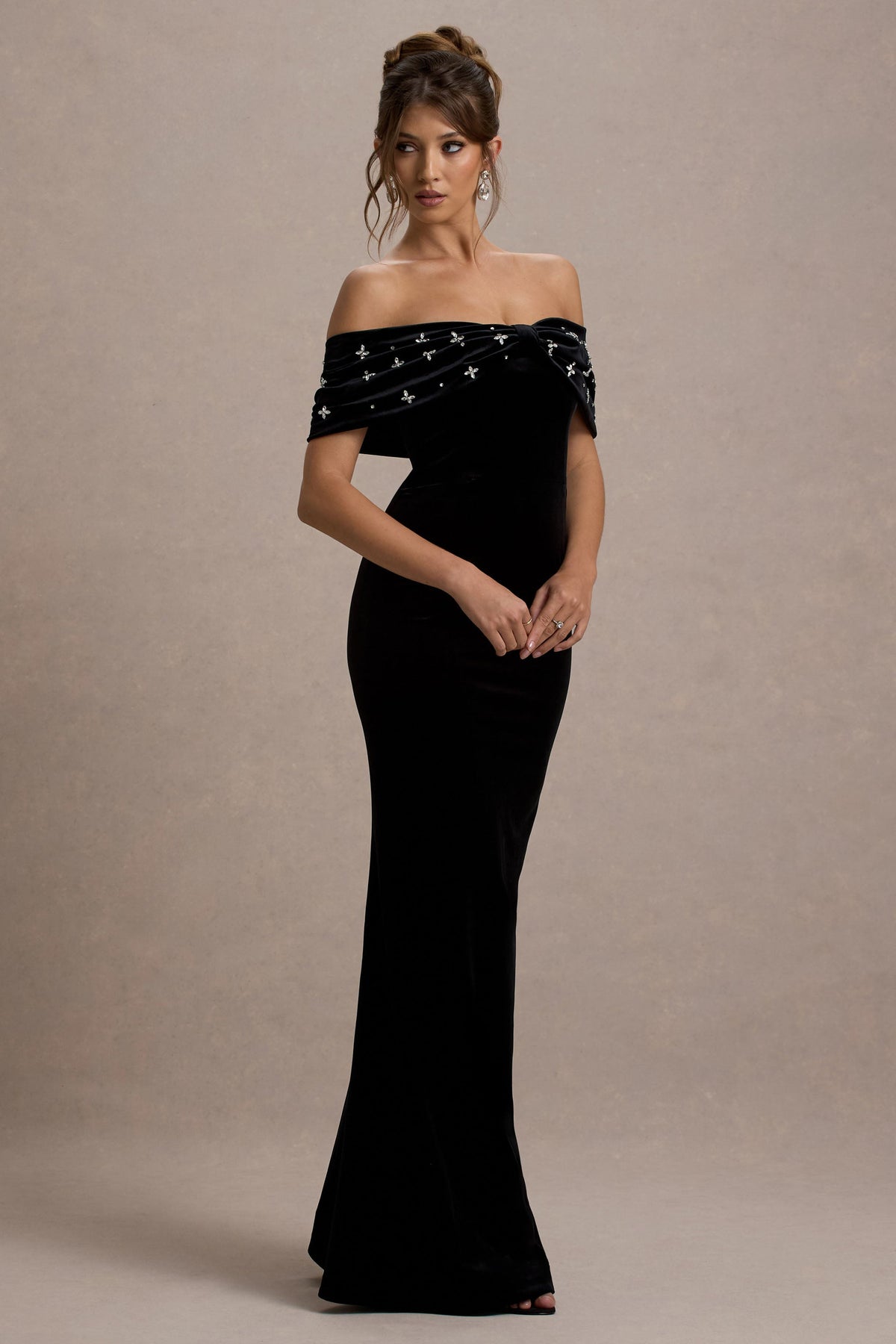 West End | Black Velvet Embellished Bardot Maxi Dress